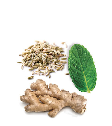 Óleo de coco, Óleo de Mentha piperita, Óleo da semente de coentro, Óleo da raiz de gengibre, Óleo da semente de Carum carvi, Óleo da semente de cardamomo, Óleo de funcho, Óleo de fruto/semente de anis-estrelado.